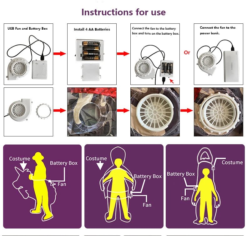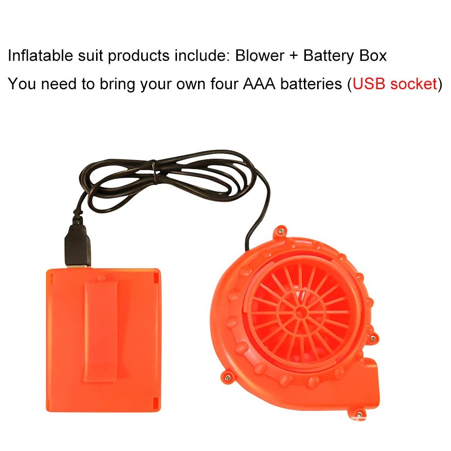 • Schnelles Aufblassystem: Der eingebaute Ventilator bläst das Kostüm in Sekunden auf und wird mit 4 AA-Batterien (nicht im Lieferumfang enthalten) oder einer USB-Powerbank betrieben.